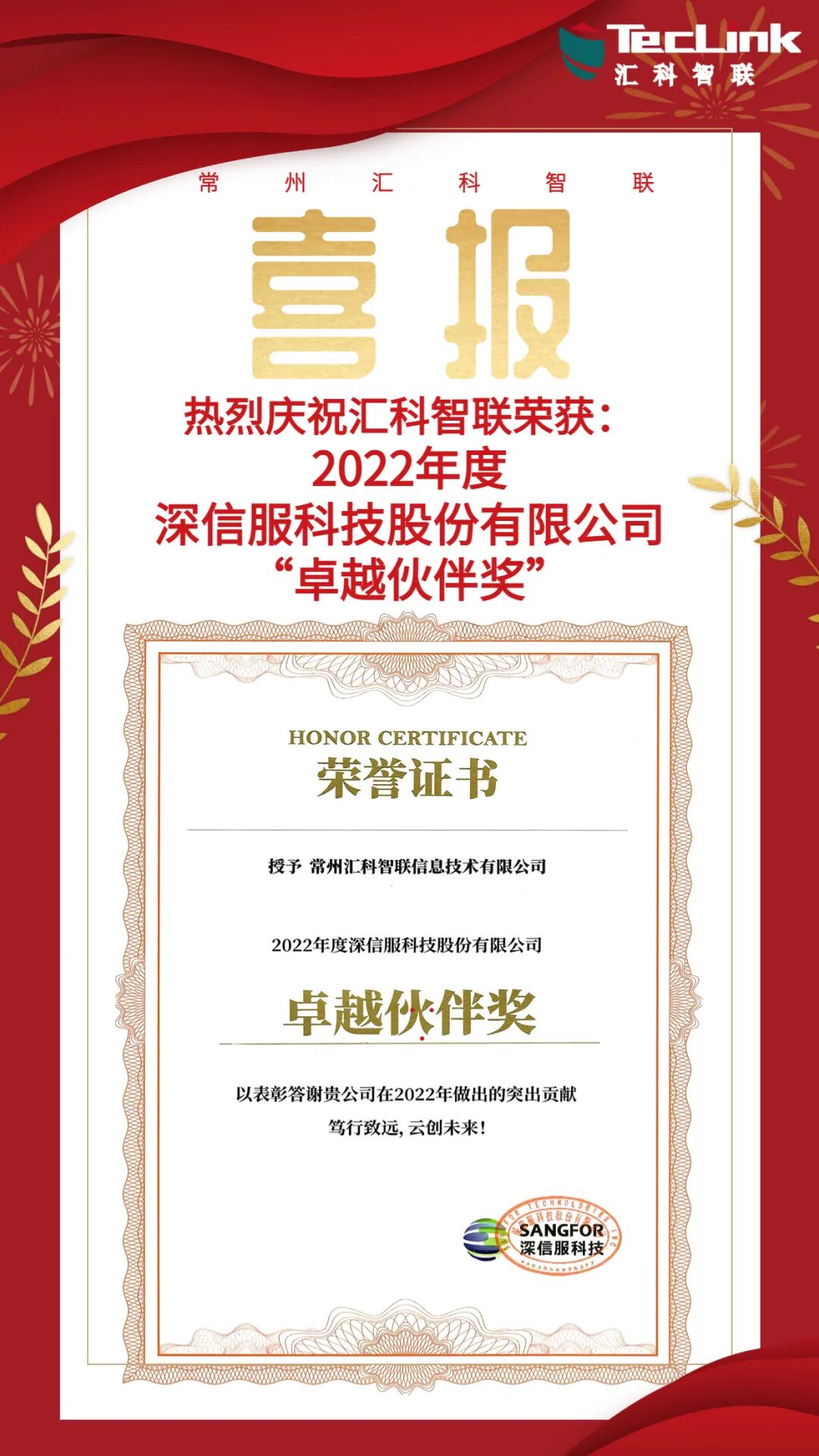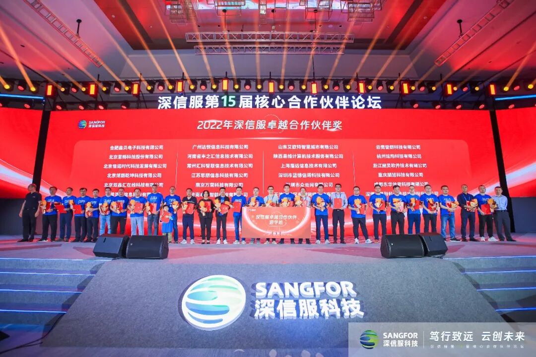 18日晚上举行了颁奖晚宴,分别颁布了“优秀ISV合作伙伴奖”、“服务之星奖”以及“卓越合作伙伴奖”等等。汇科智联凭借2022年度过硬的技术及优秀的业绩,成功获得了“2022年度深信服卓越合作伙伴奖”。